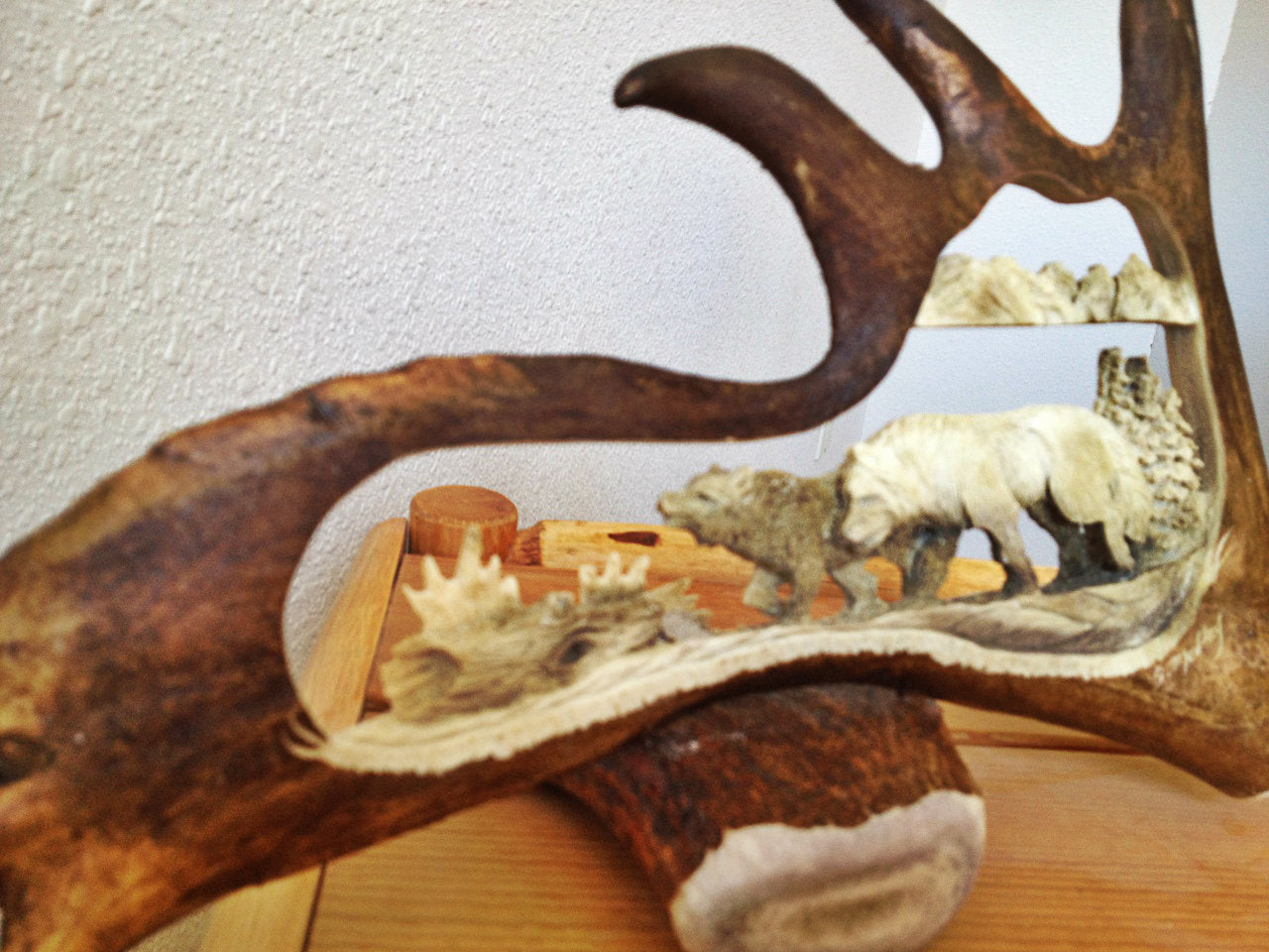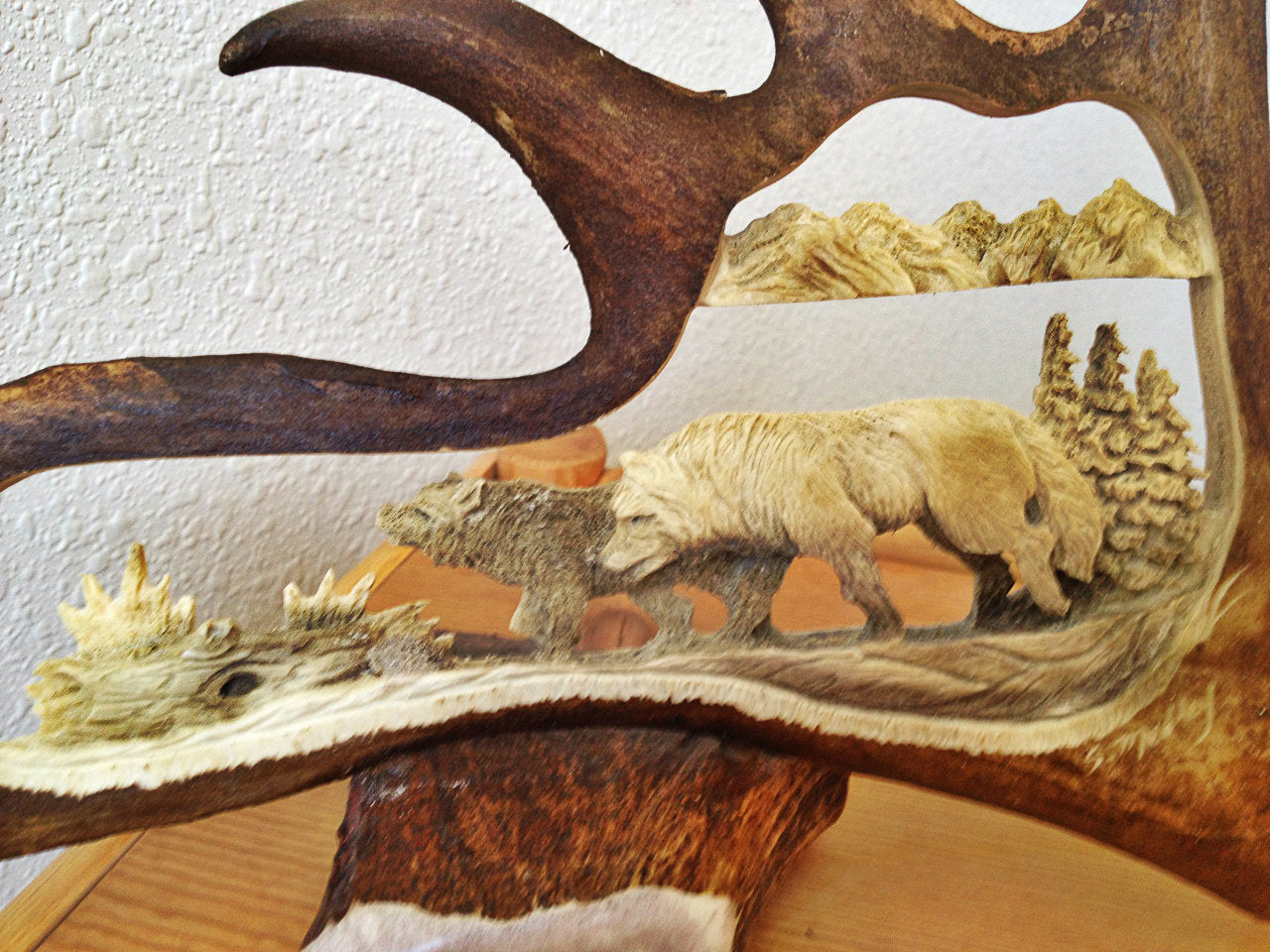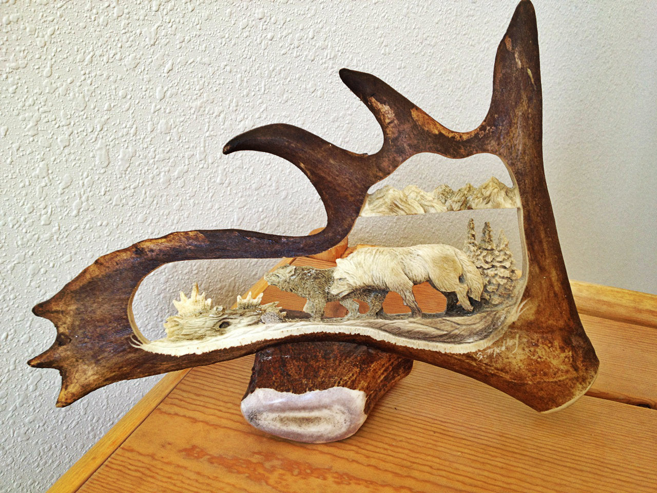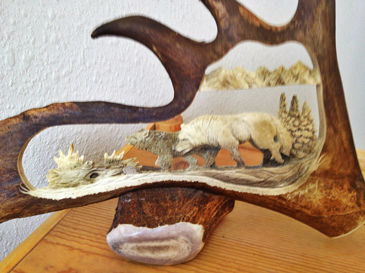 Next, a lot of time and effort goes into each and every antler carving, which is seen in all of the minute details that goes almost unnoticed by the untrained eye, unless you really look for it. Each piece of antler art is crafted one step at a time and created by the work of a true artist’s hand- that is how it becomes a unique, one of a kind, work of art. Each carving is individually hand carved by a senior professional antler carving artisan who has decades of experience. The artists' focus on detail makes every carving incredibly real to life and is what makes each carving a true work of art. Our carving Artisan has decades of watching and learning from her father who himself was a professional antler carver for many years. Since then she has put in years and years on her carving trade, professionally adjusting her technique and tools to accomplish the professional works of art that she is proud of having displayed in your home, office or cabin.
