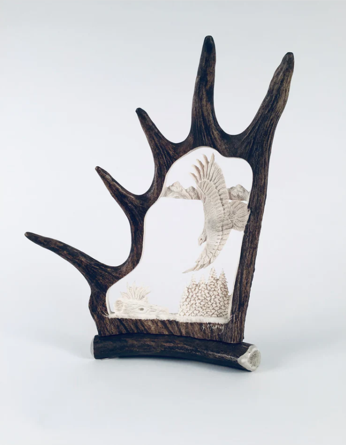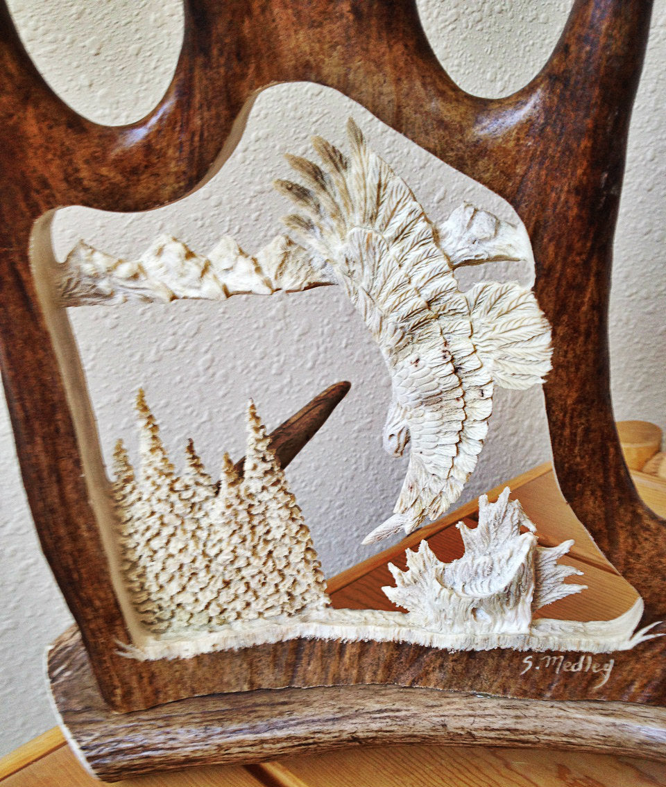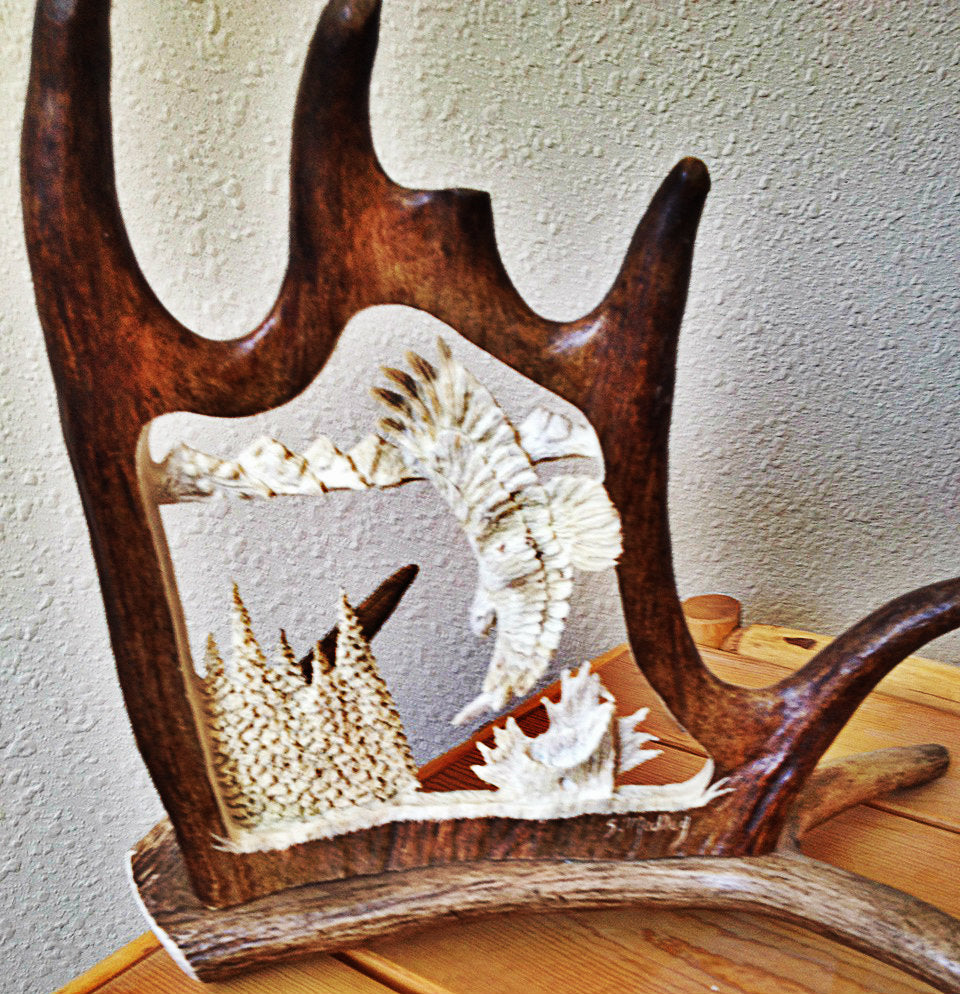 Next, a lot of time and effort goes into each and every antler carving, which is seen in all of the minute details that goes almost unnoticed by the untrained eye, unless you really look for it. Each piece of antler art is crafted one step at a time and created by the work of a true artist’s hand- that is how it becomes a unique, one of a kind, work of art. Each carving is individually hand carved by a senior professional antler carving artisan who has decades of experience. The artists' focus on detail makes every carving incredibly real to life and is what makes each carving a true work of art. Our carving Artisan has decades of watching and learning from her father who himself was a professional antler carver for many years. Since then she has put in years and years on her carving trade, professionally adjusting her technique and tools to accomplish the professional works of art that she is proud of having displayed in your home, office or cabin.