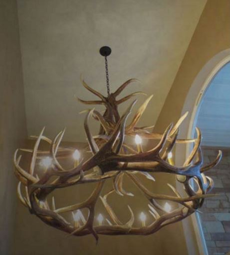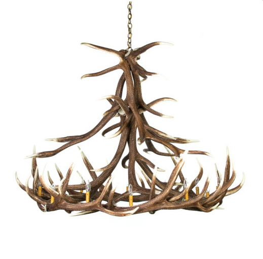This amazing elk chandelier has two tiers and one row of 12 candelabra lights. Chandelier comes complete with 3 feet of chain and canopy mounting kit.