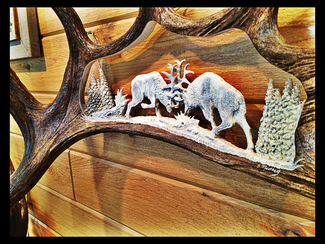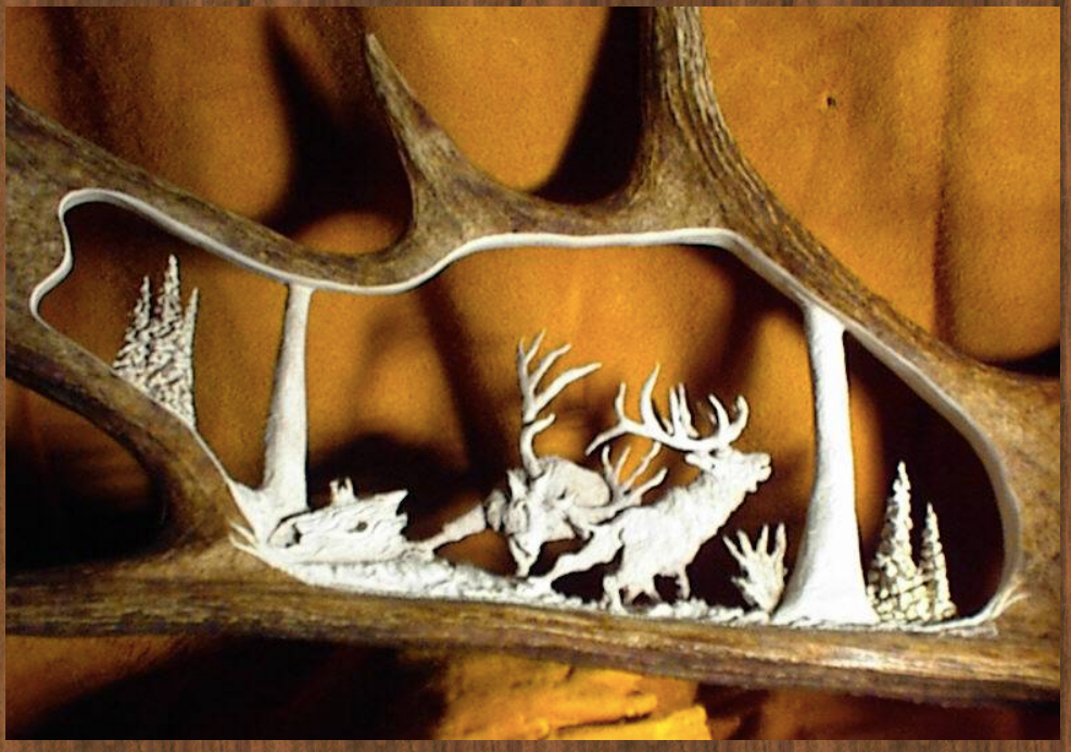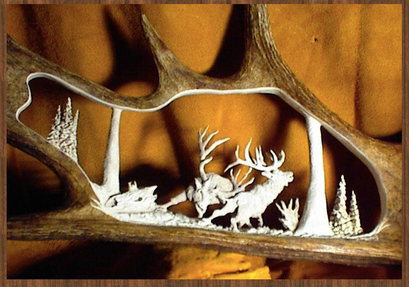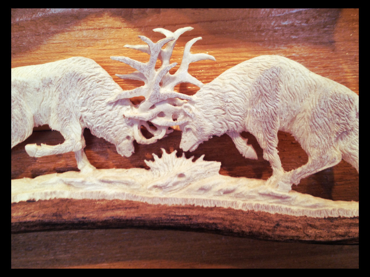 This work of horn carving art shows two majestic bull elk fighting for their lives and the right to carry on the ancestral rights of the herd.