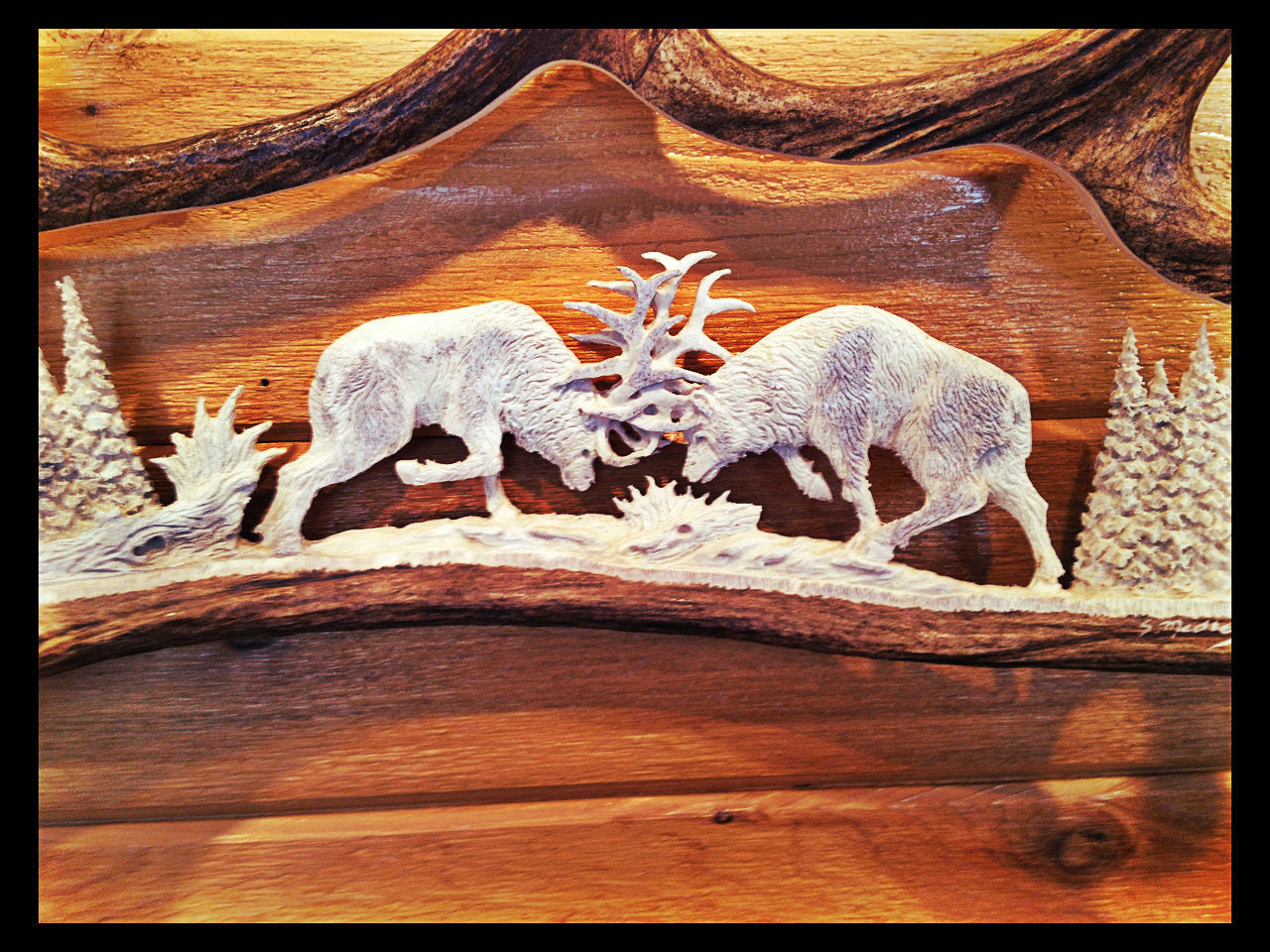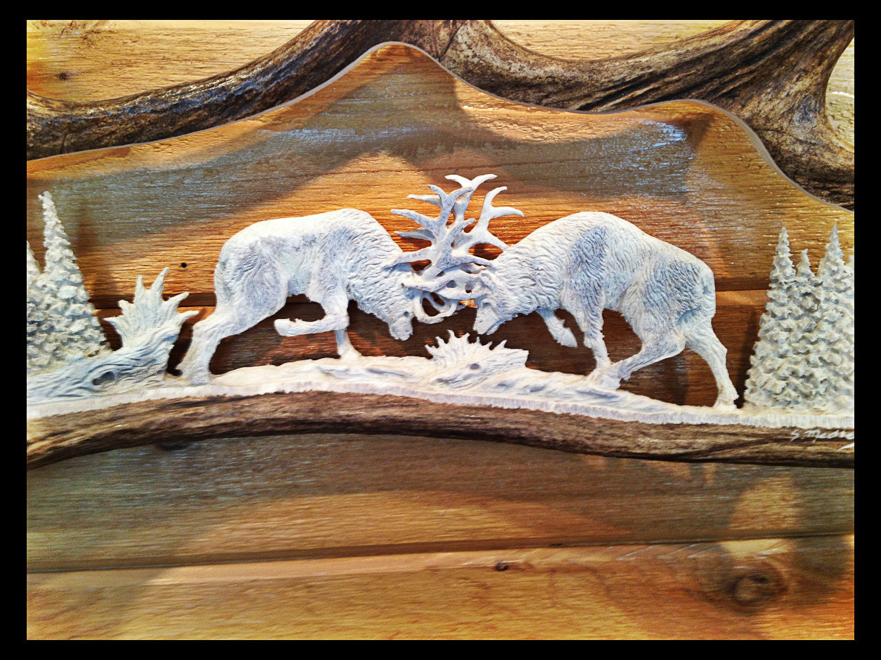 The Rut, the fight to breed is natures way so only the strongest and best genetics are passed on to the next generation. This Alaskan moose antler carving is STRIKING and stylish!
