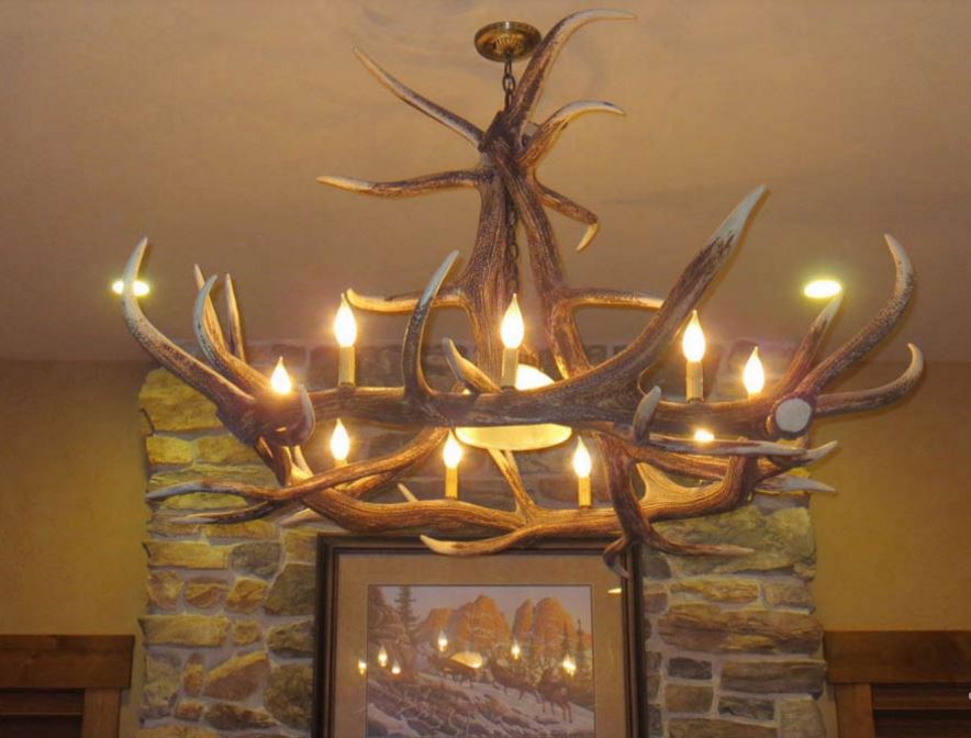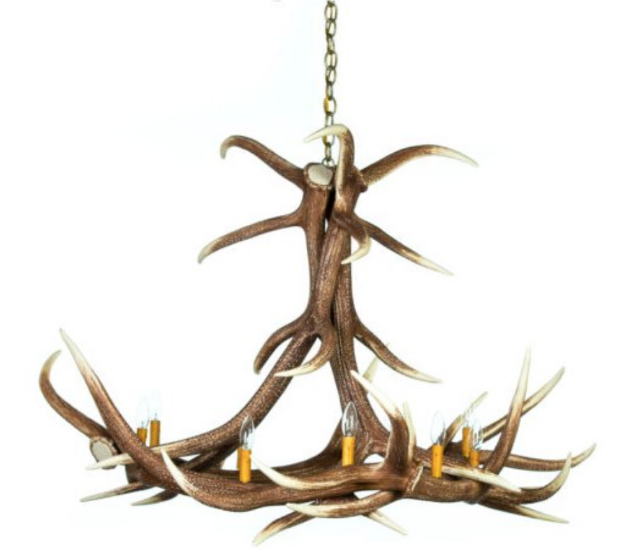 The Ghost Mountain resin elk antler chandelier has 9 soft candle lights, 6 beautifully shaped and polished cast elk antlers and weighs a lightweight 18 pounds. With nine 25-watt candle lights, the amount of light is flawless in the right space.
