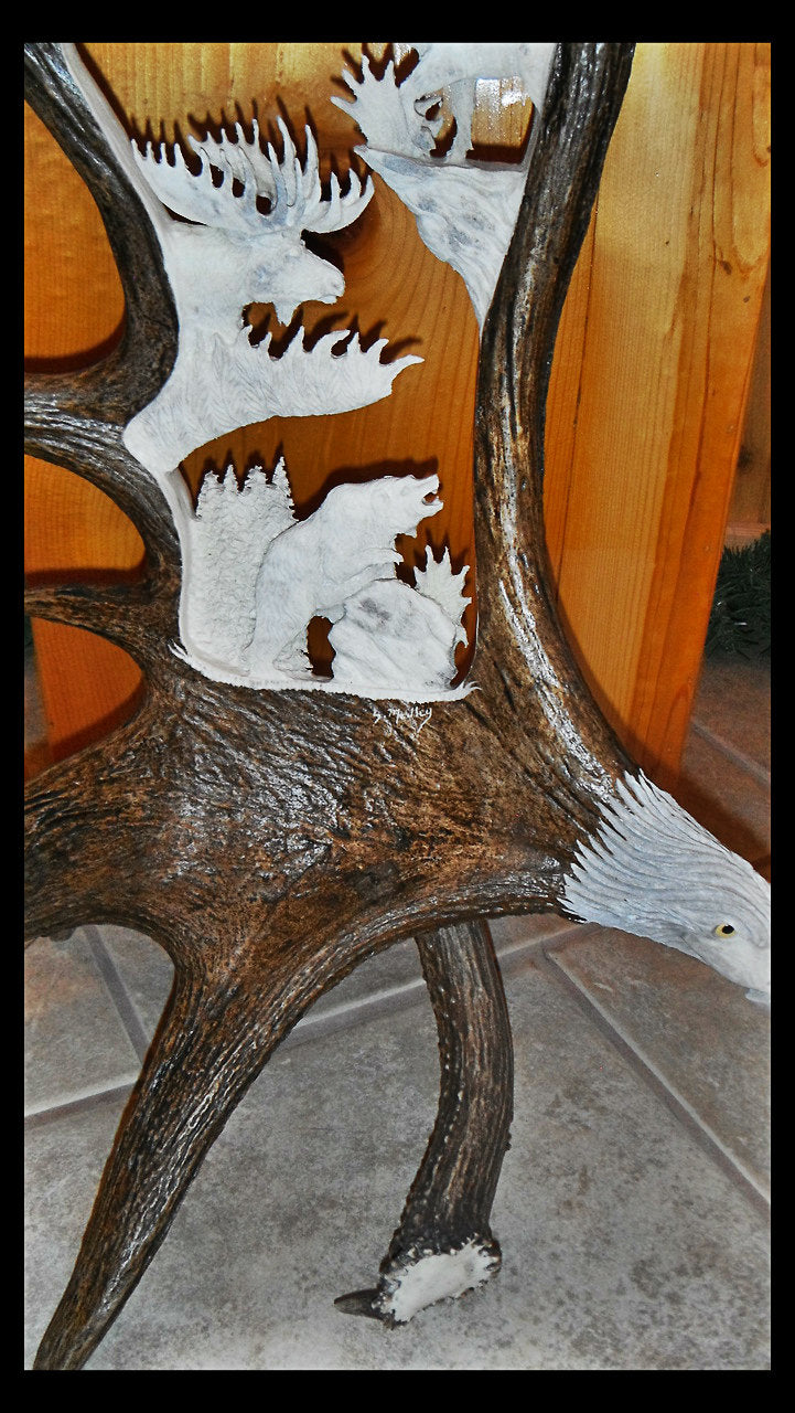 Moose antler carving at it's finest done by a professional antler carver with over 30 years of experience! Use the zoom feature to notice all of the amazing detail carved into this moose antler art Masterpiece!