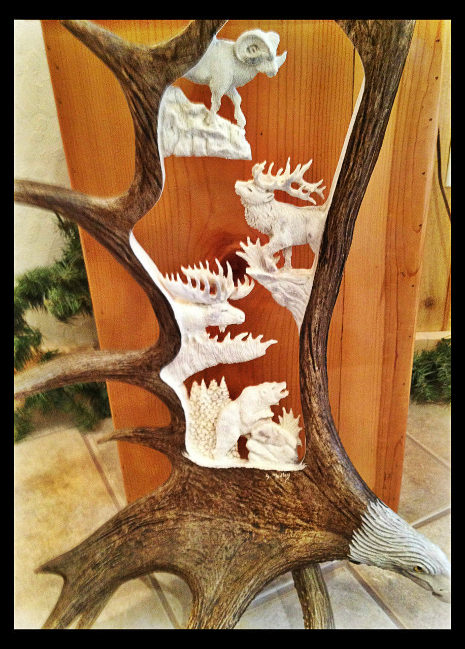 This uniquely different and breathtaking Alaskan moose antler carving includes a BIG Bull Moose, a Majestic Sheep, a Huge Bear and a Herd Bull Elk.