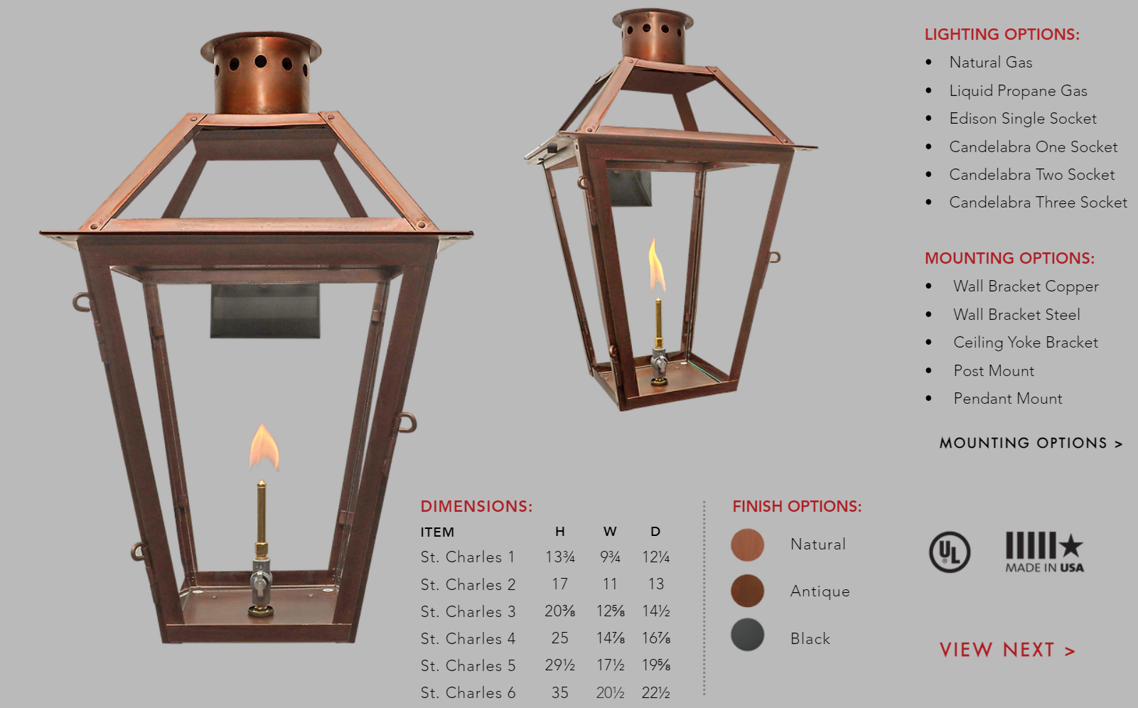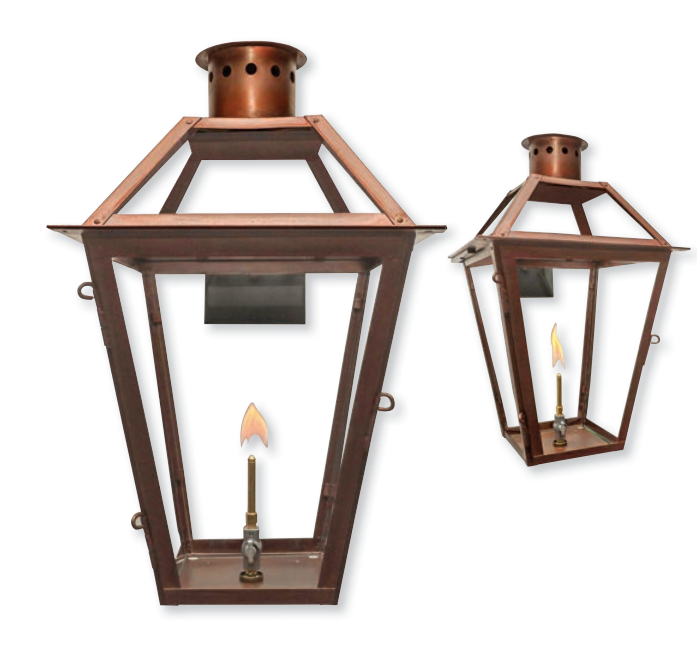 The St. Charles traditional style lantern favors a timeless appeal that’s elegant, comfortable, and understated. St. Charles is crafted from copper and tempered glass and is available with a solid or glass top and gas or electric components.