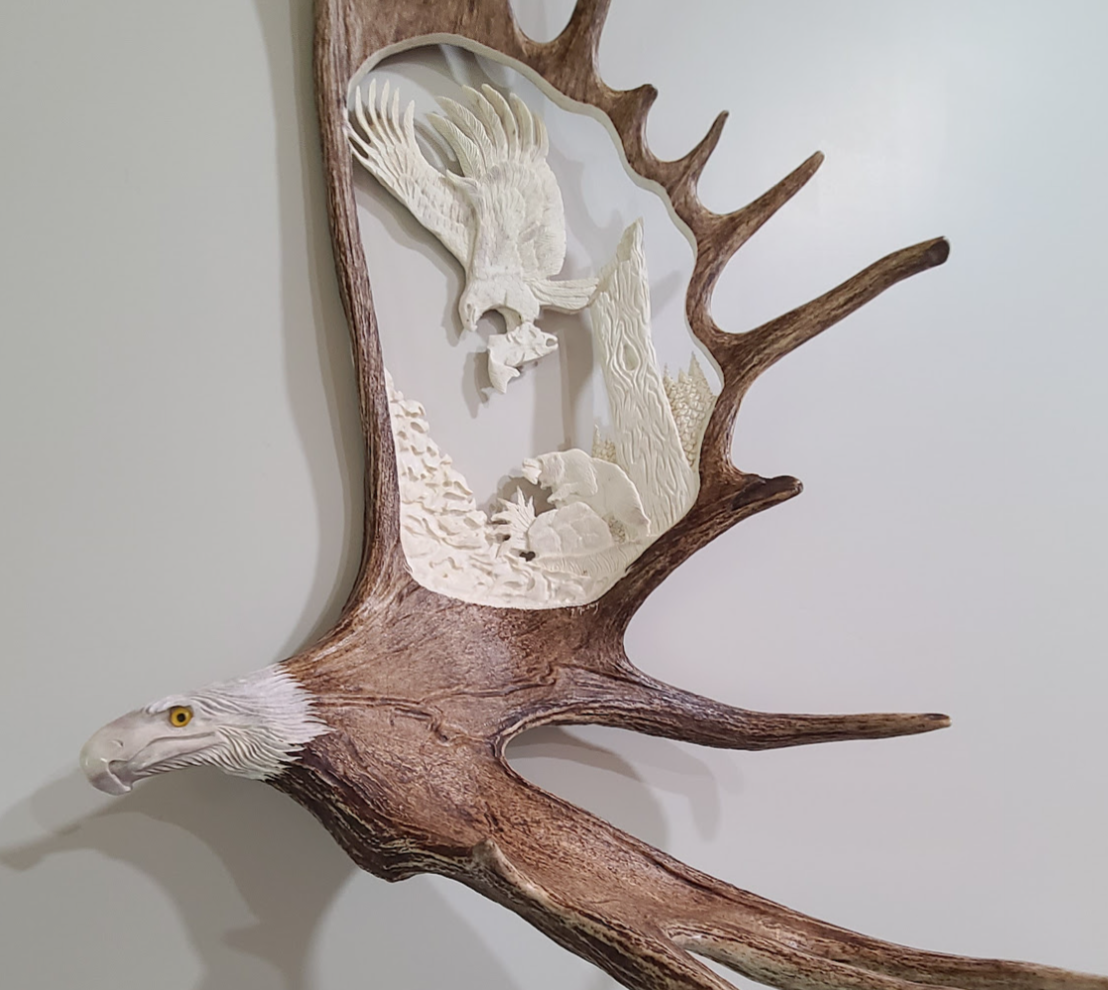 If you prefer to have it as a wall hanging, we can take off the antler base. The Alaskan moose antler carving also includes a beautiful moose antler eagle carving with an amazing eagle head which in itself is spectacular.