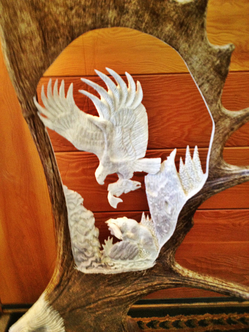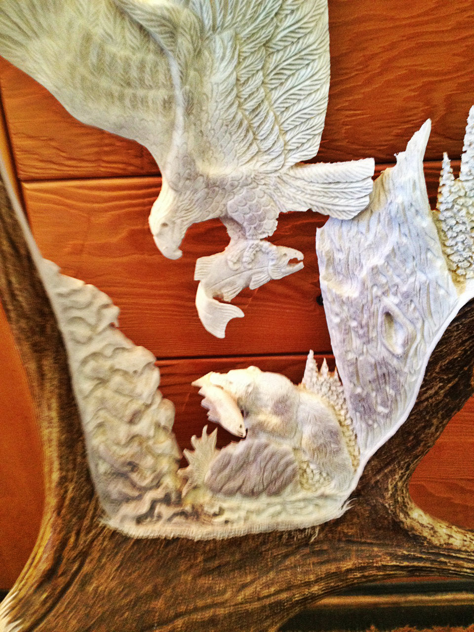 The moose antler carving shows an eagle and bear both catching a salmon at the same time on the same stretch of river.