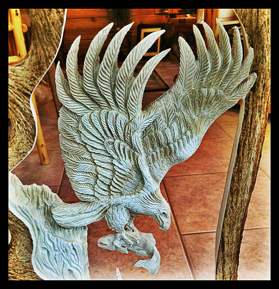 The Last Catch Bear Moose Antler Carving with carved Eagle Head uses a beautiful, real moose antler shed for this amazing looking antler sculpture.