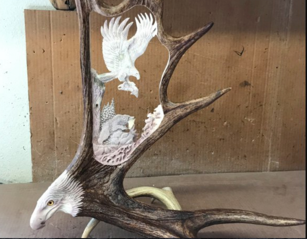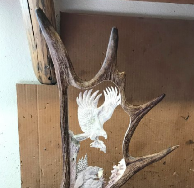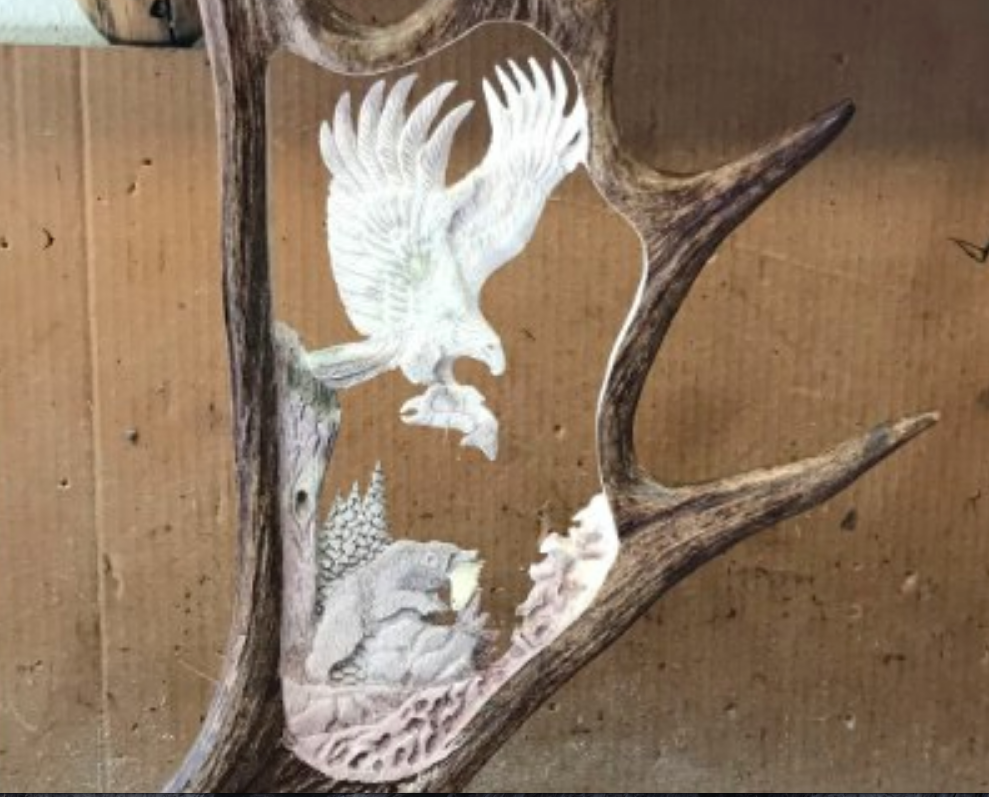 Next, a lot of time and effort goes into each and every antler carving, which is seen in all of the minute details that goes almost unnoticed by the untrained eye, unless you really look for it. Each piece of antler art is crafted one step at a time and created by the work of a true artist’s hand- that is how it becomes a unique, one of a kind, work of art. Each carving is individually hand carved by a senior professional antler carving artisan who has decades of experience. The artists' focus on detail makes every carving incredibly real to life and is what makes each carving a true work of art. Our carving Artisan has decades of watching and learning from her father who himself was a professional antler carver for many years. Since then she has put in years and years on her carving trade, professionally adjusting her technique and tools to accomplish the professional works of art that she is proud of having displayed in your home, office or cabin.