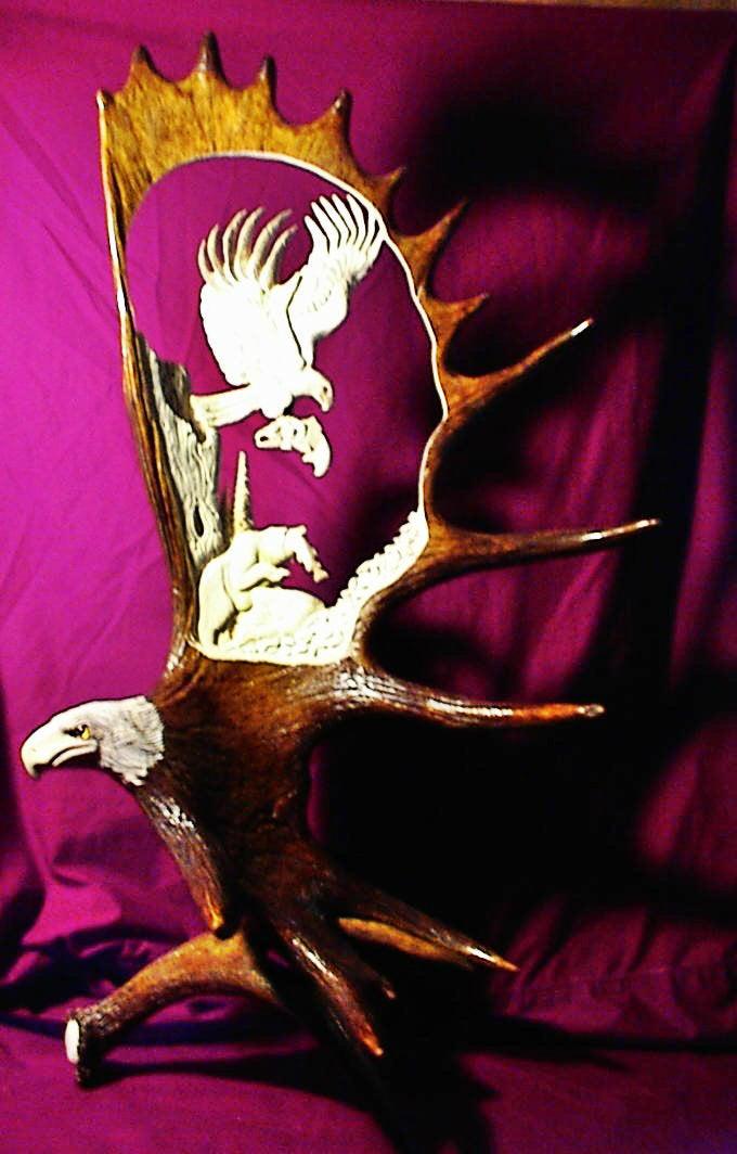 This beautiful moose antler art is a real tribute to two powerful predators of the wilds. The eagle, a mighty predator of the skies and the bear, a mighty land predator.