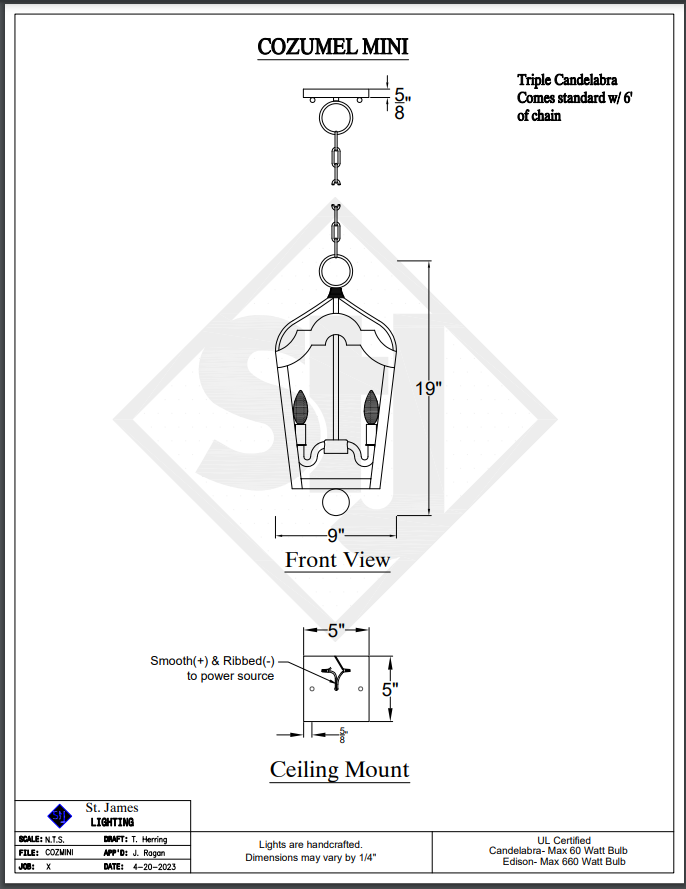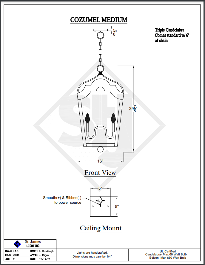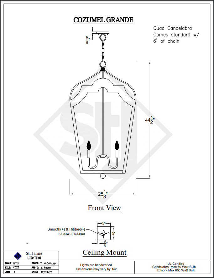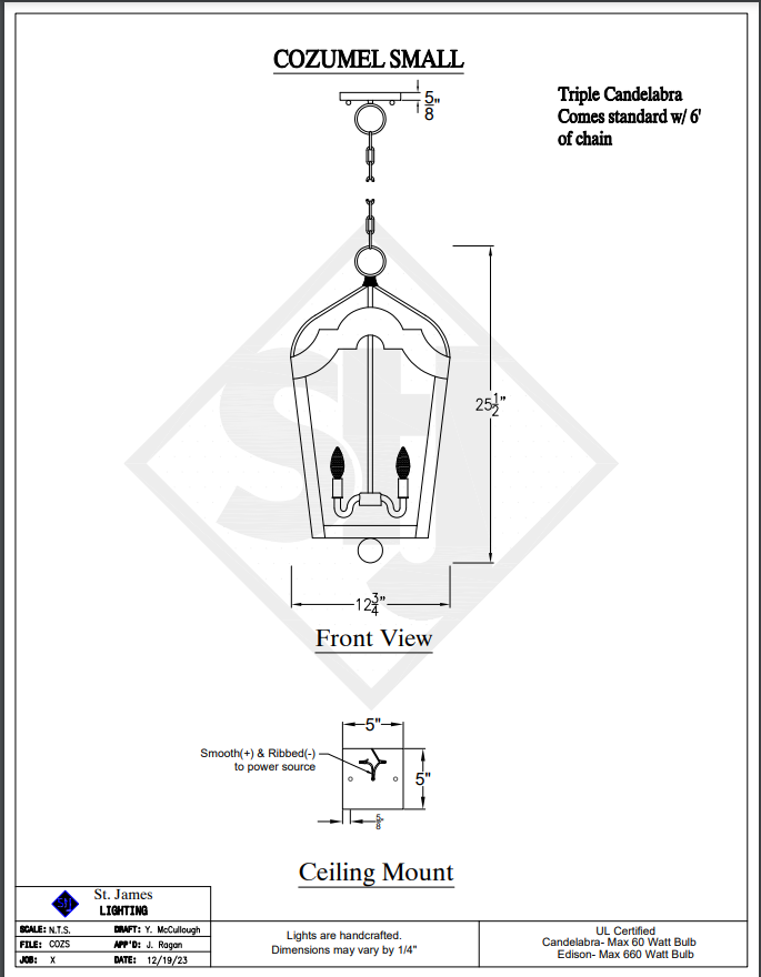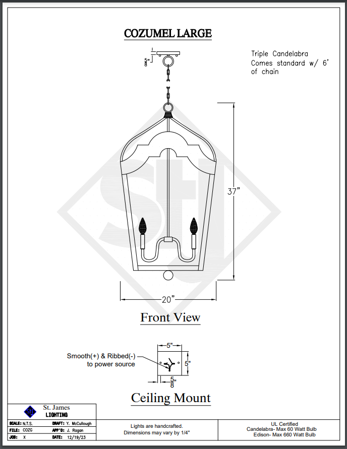 St. James Lights are called “lifetime fixtures” because when you purchase a St. James Lantern or Chandelier, you are making an investment that will last a lifetime and will be the last light fixtures you will ever need to buy. Each light is individually hand-crafted and inspected to ensure that you receive the highest quality lantern or chandelier available anywhere in the world.
