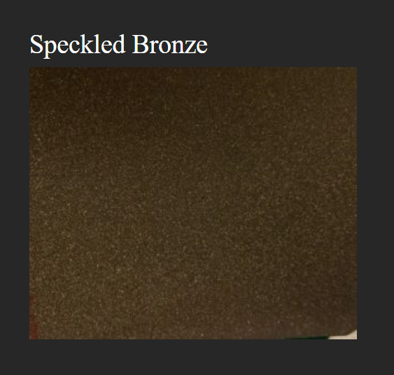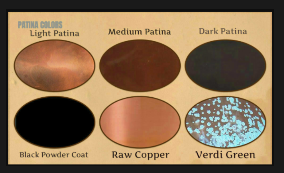 Our finish color chart currently includes: Raw Copper, Light, Medium and Dark Patina, Verdi Green, Liver of Sulfur and the following Powder Coats- Matte/Flat Black, Oil Rubbed Bronze, AAMA Bronze, Chrome II, Black Chrome, Starlight Black, ORB, Stainless Steel 2.5, Sam Hammer Grey, Satin Nickel, Silver Tex, Pompeian Gold II, Harvest Gold, Pacific Silver, Speckled Bronze, Anodized Bronze, Quaker Bronze, Bright Blue, Flat White, Lime Green, Light Green and Dark Sienna.