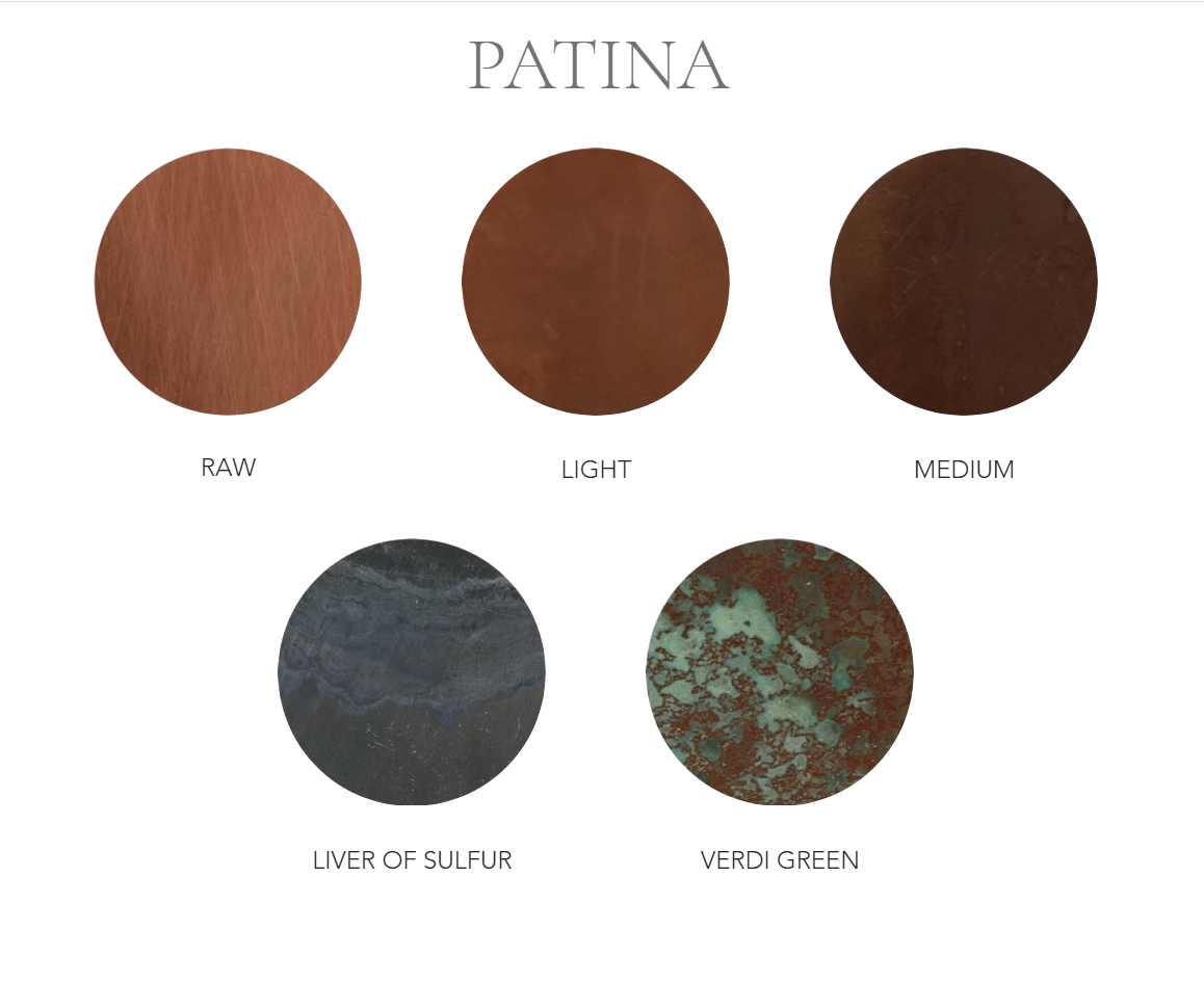 All patina finishes are the result of a chemical process that involves many different factors. There can be variations in color and consistency. As the Patina is a living finish, it will continue to change over time.