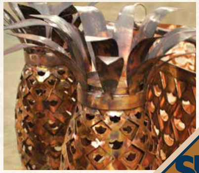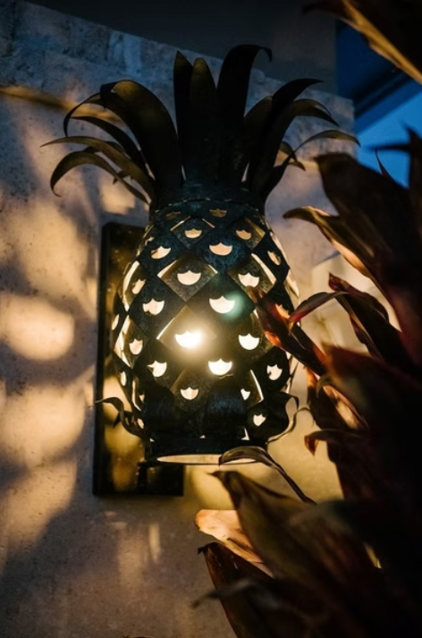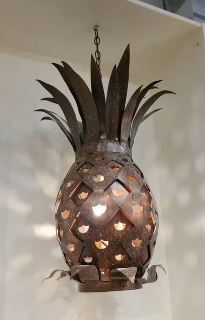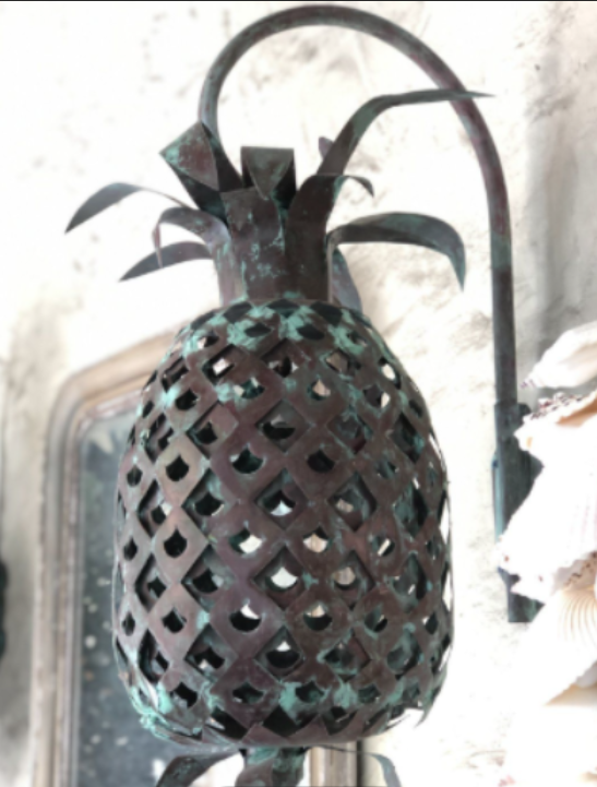 The Pineapple has a Copper body with a patina or powder coat finish, a clear acrylic cylinder to protect the bulb and a steel bracket with a black powder coat finish- unless you prefer a different powder coat finish color. Many additional styles and sizes are available upon request!