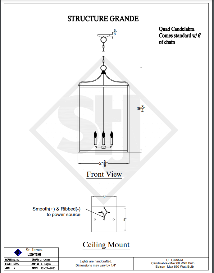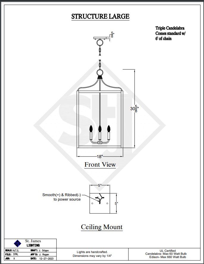 St. James Lights are called “lifetime fixtures” because when you purchase a St. James Lantern or Chandelier, you are making an investment that will last a lifetime and will be the last light fixtures you will ever need to buy. Each light is individually hand-crafted and inspected to ensure that you receive the highest quality lantern or chandelier available anywhere in the world.
