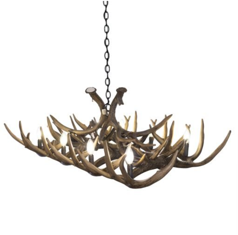 The Mount Borah Faux 12 Antler Table Chandelier has an edgy square profile. Built with 12 large whitetail deer antlers and comes with 8 lights. This modern rustic chandelier was designed to hang over a dinning room table or pool table.