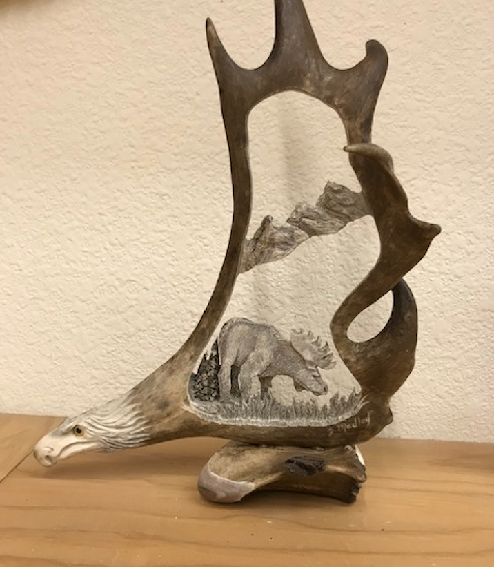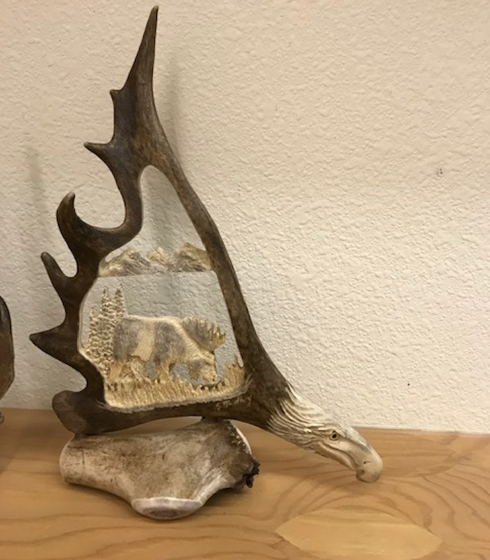The Wild Moose Antler Carving size is approximately 10" tall by 10" wide and carved from Alaska Caribou antlers.