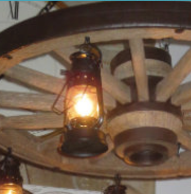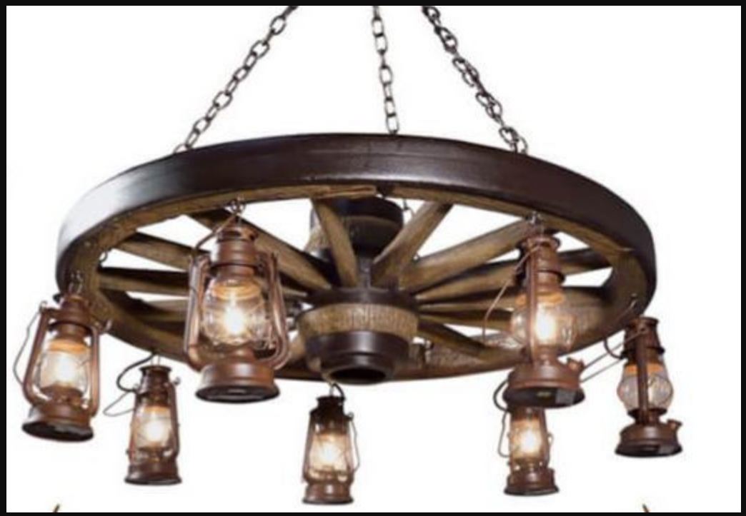 A newer design, the Buffalo Bill Large Wagon Wheel Rustic Chandelier has 7 lanterns with 25-watt lights in each.